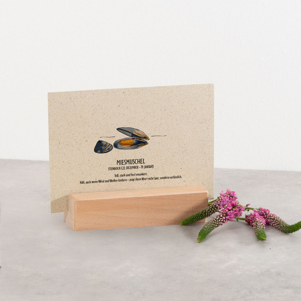 Die Miesmuschel steht für innere Stärke, Ausdauer und Verlässlichkeit. Fest verankert trotzt sie Wind und Wellen – leise, aber beständig. Wie der Steinbock zeigt sie, dass wahre Stabilität nicht laut sein muss.